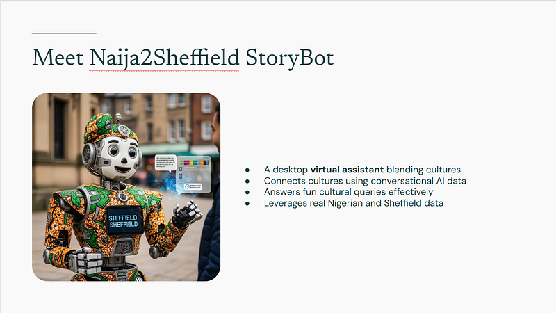 Our session introduced the Naija2Sheffield StoryBot, a desktop virtual assistant we built that beautifully blends Nigerian and Sheffield cultures using AI and C#. The core of our presentation explored how we integrated AI and cultural storytelling to create this unique tool.